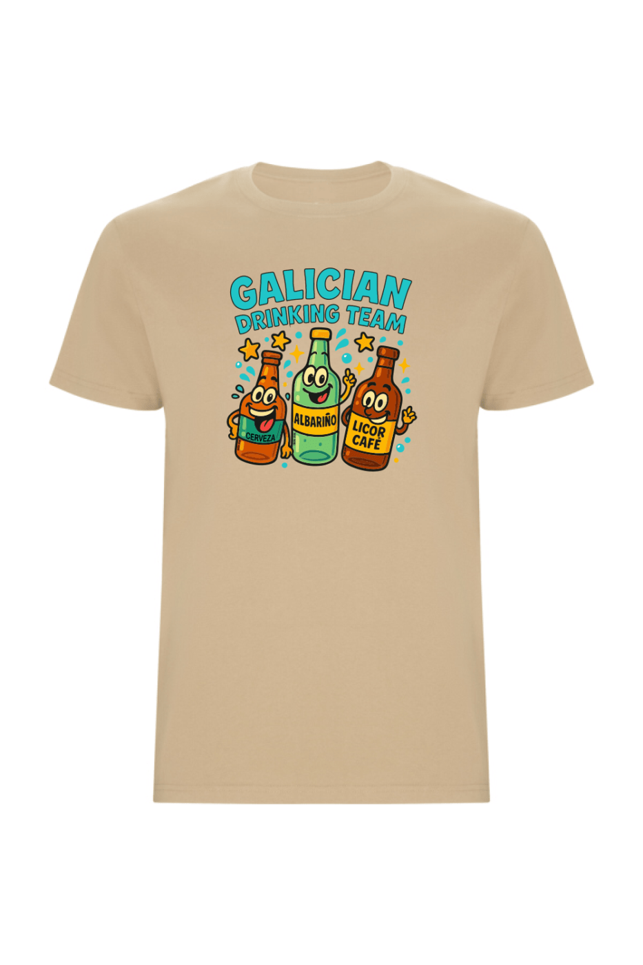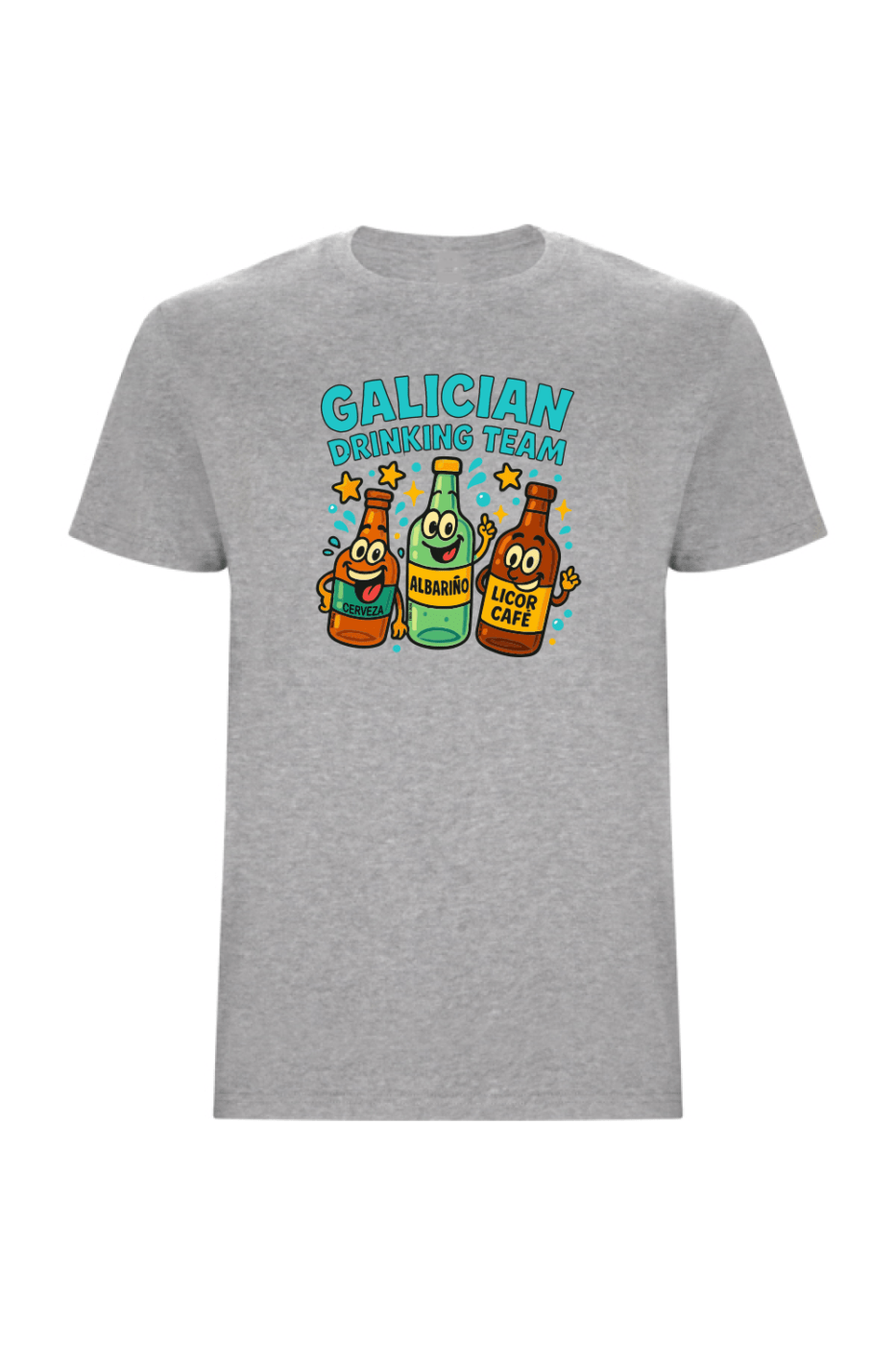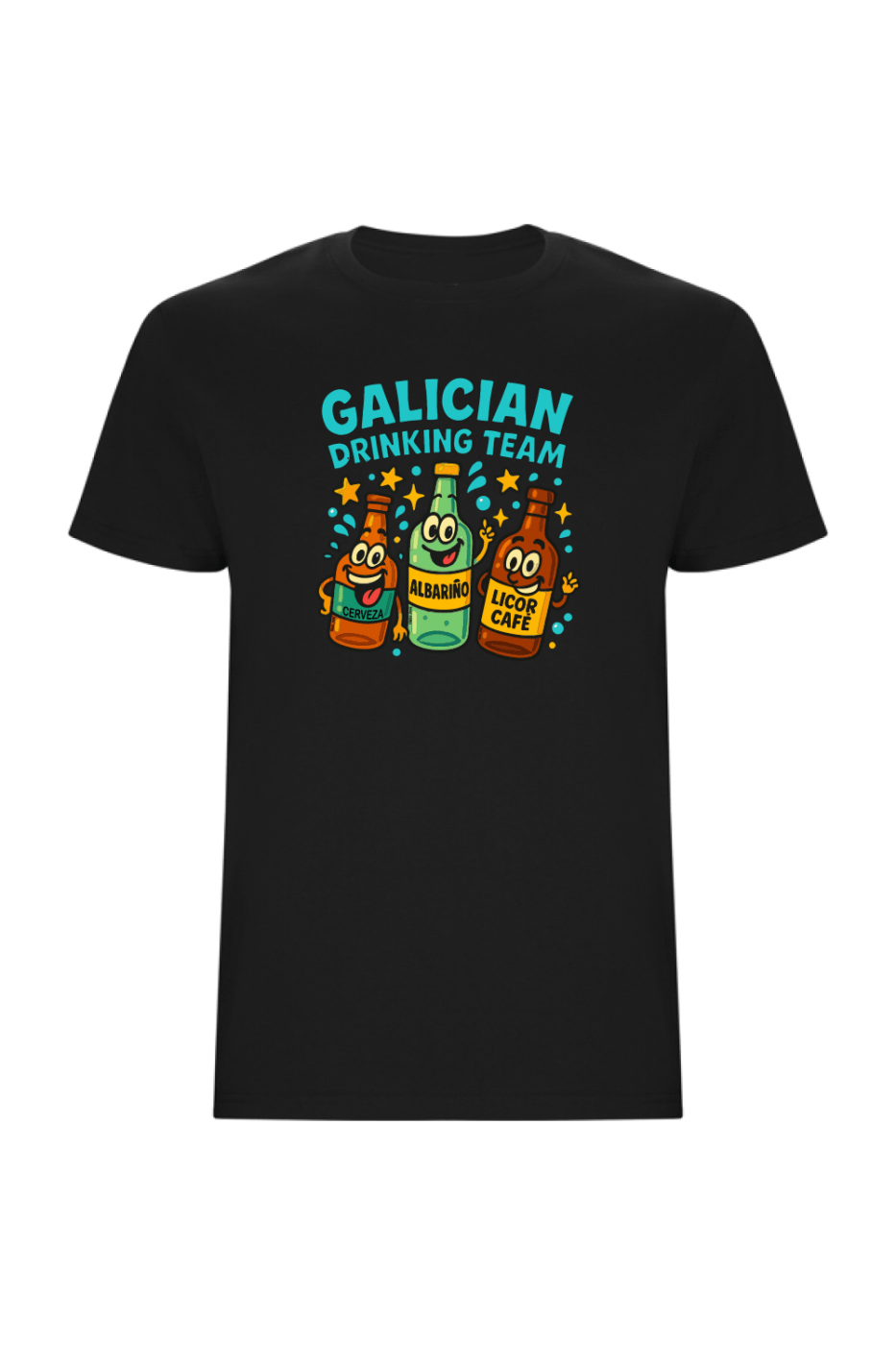 ¡Demuestra tu orgullo gallego con humor! 🍻 Esta camiseta presenta un divertido diseño con tres simpáticas botellas —Cerveza, Albariño y Licor Café— bajo el lema “Galician Drinking Team”. Perfecta para fiestas, reuniones con amigos o para llevar ese toque gallego a cualquier lugar.