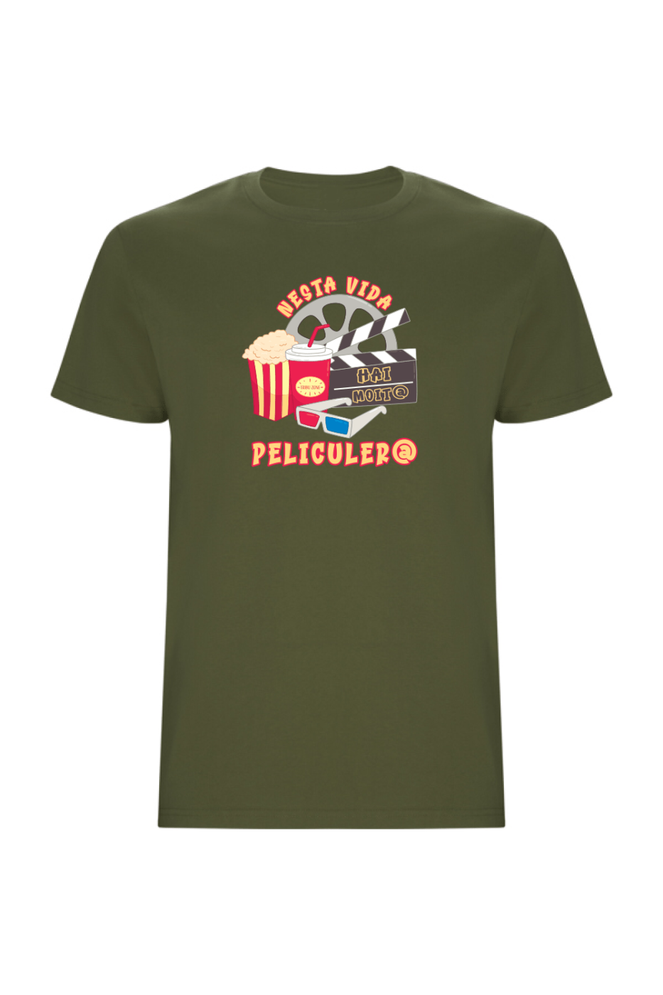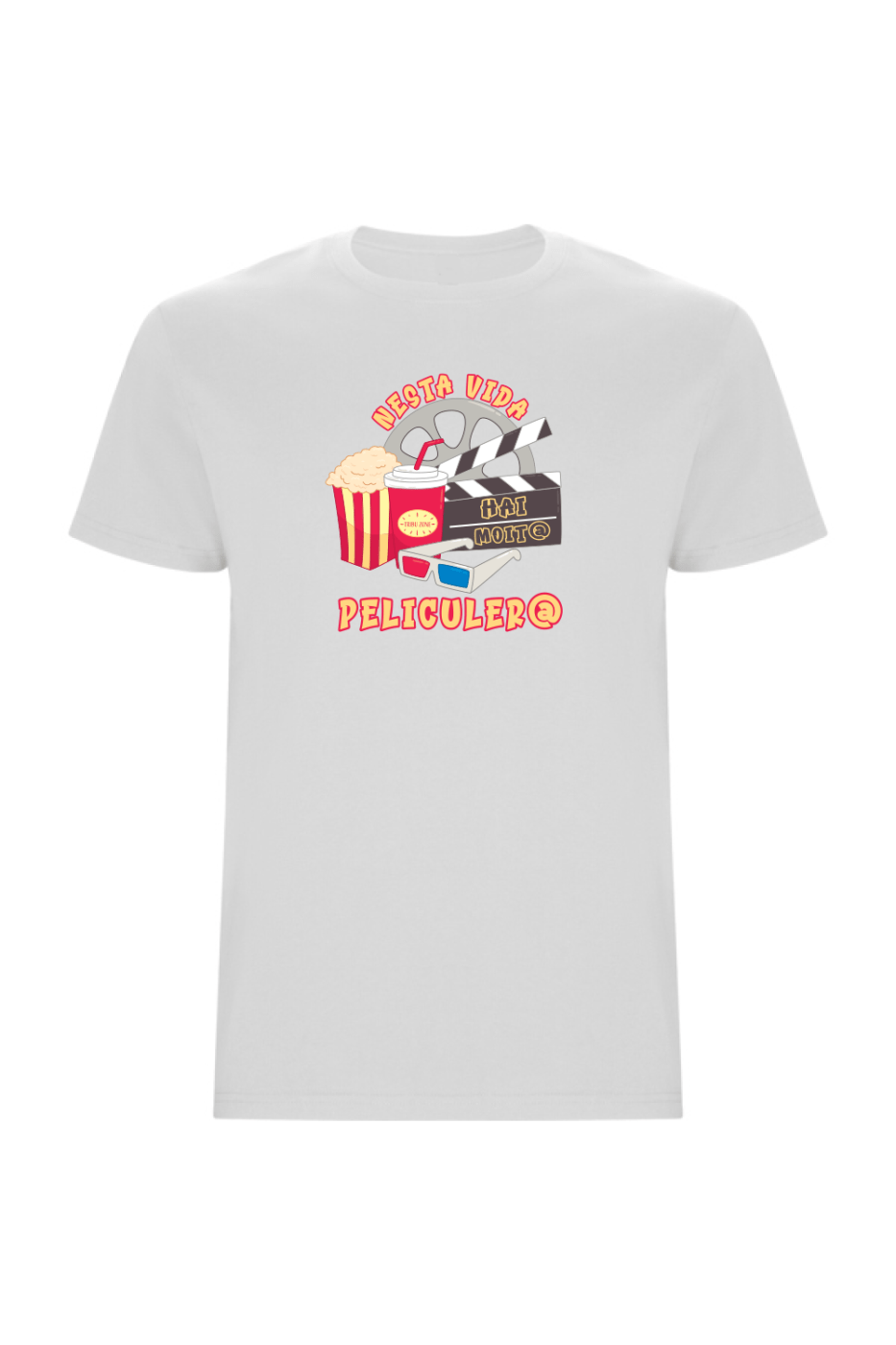 Su diseño frontal combina elementos clásicos del mundo cinematográfico —palomitas, claqueta, gafas 3D y refresco— junto a la frase “En esta vida hay mucho peliculer@”, ideal para quienes viven la vida como una película.